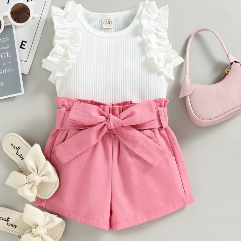 BLUSA BLANCA Y SHORT ROSA CON CINTO T 24 MESES