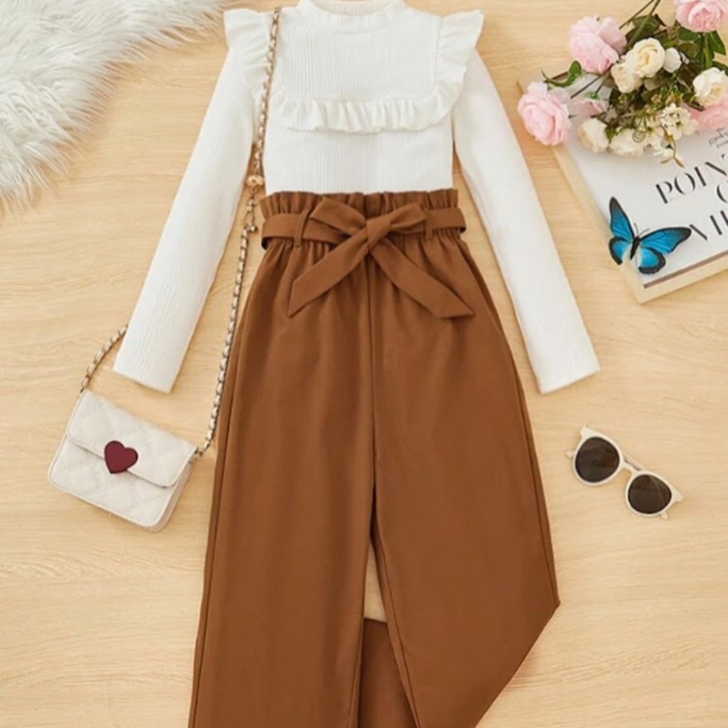 BLUSA MANGA LARGA CON PANTALÓN MARRÓN Y CINTO T 8 AÑOS