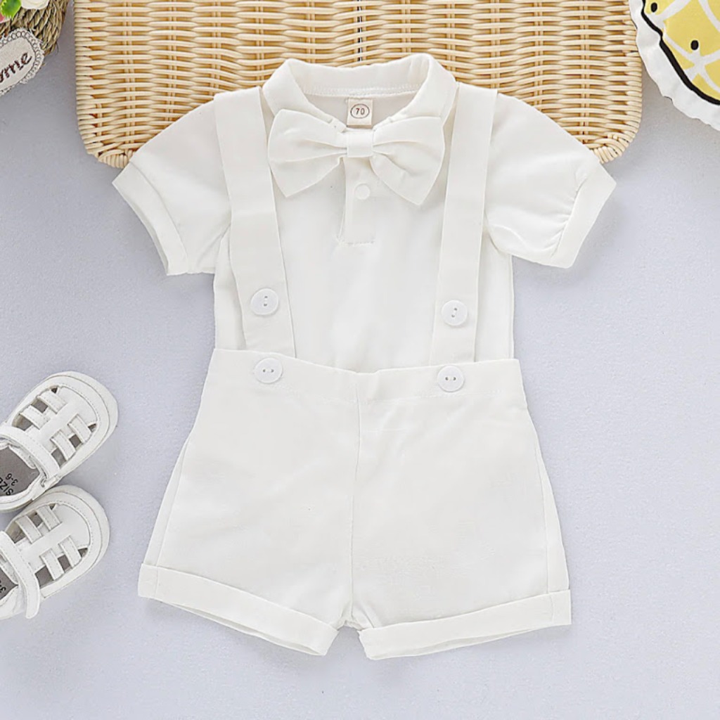 CONJUNTO CAMISA BODY CON SHORT CON TIRANTES Y MOÑO BLANCO 3-6M