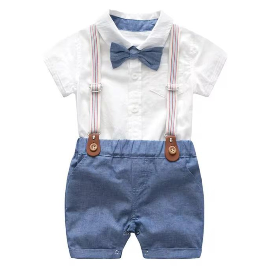 CONJUNTO CAMISA BODY, SHORT AZUL, TIRANTES Y MOÑO T 18-24 MESES