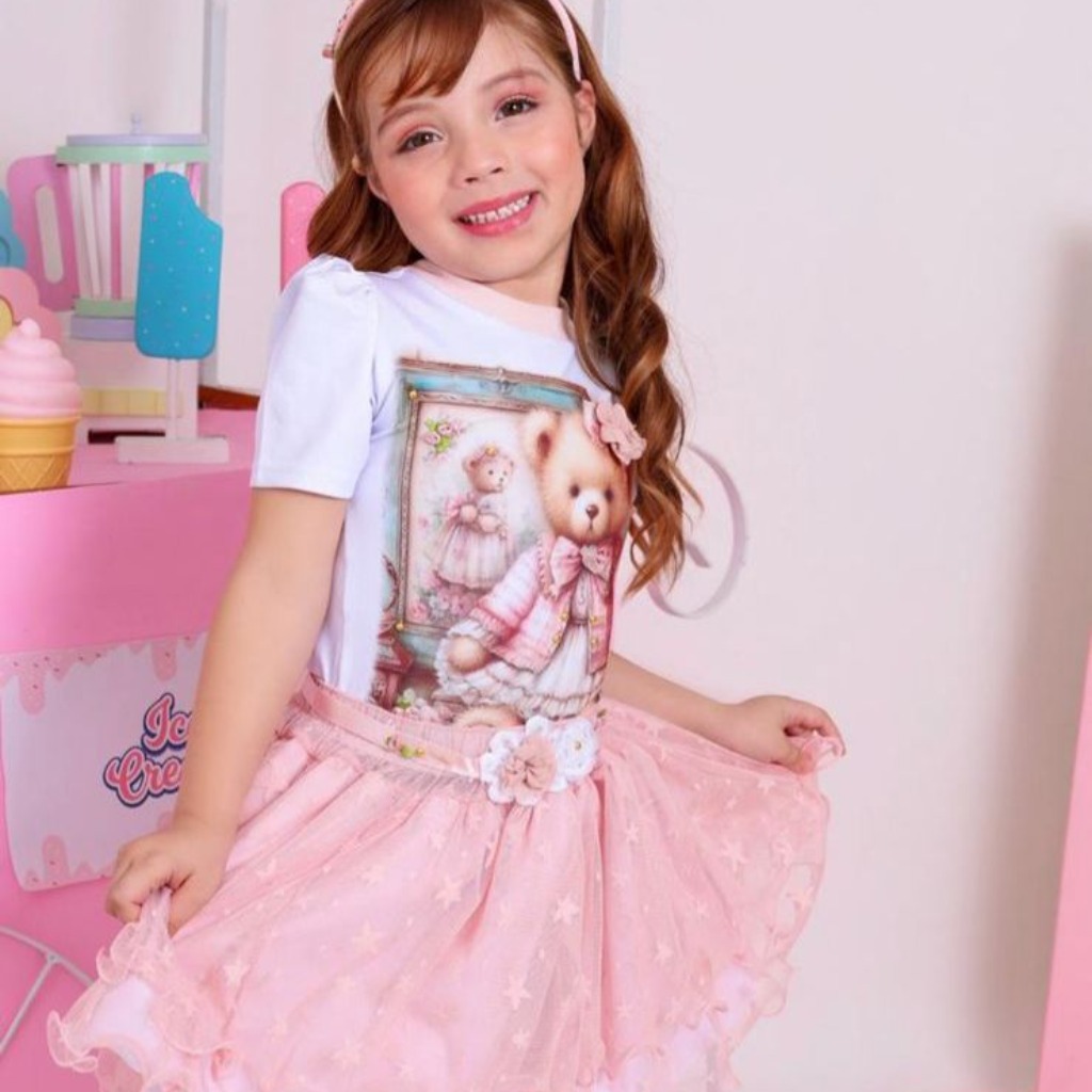 CONJUNTO REMERA OSITO CON POLLERA TUL Y VINCHA T 5 AÑOS