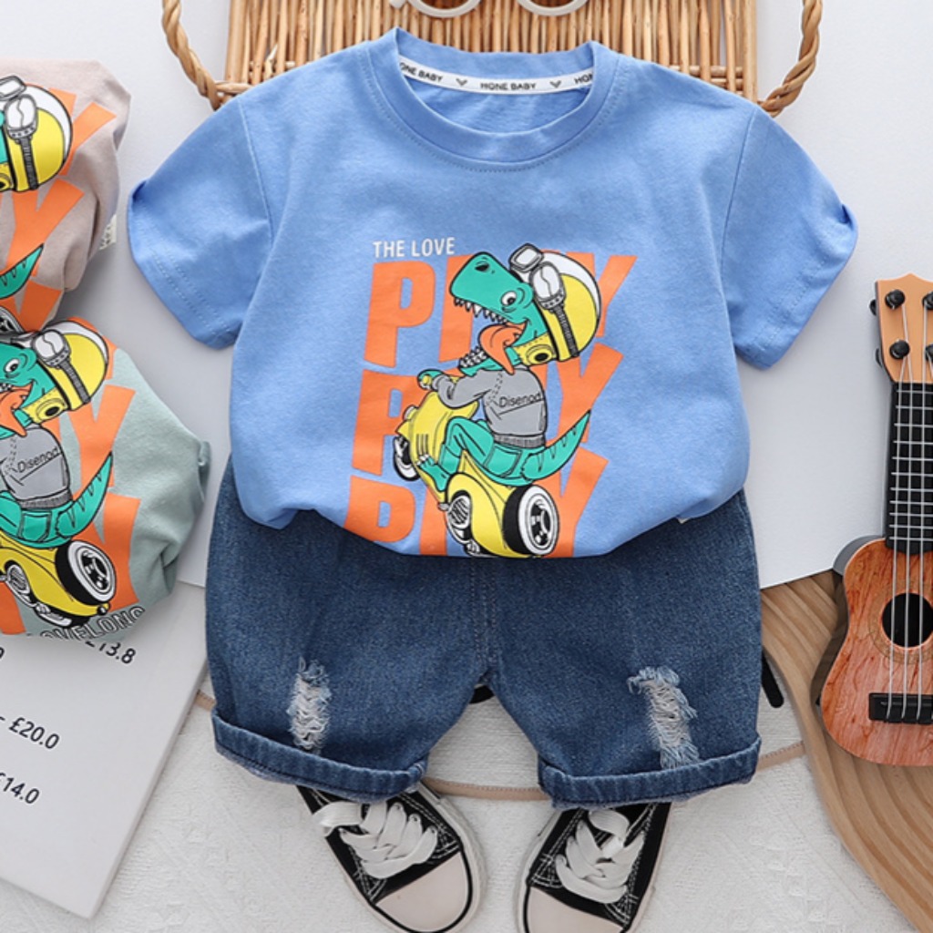 CONJUNTO REMERA CELESTE DINO CON SHORT DE JEANS T 12-18 AÑOS