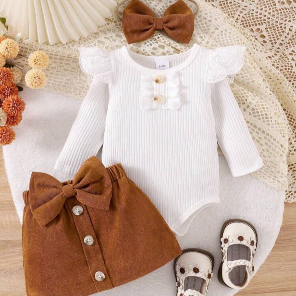 POLLERITA, BODY MANGAS LARGAS CON BRODERI Y VINCHA T 12-18 MESES