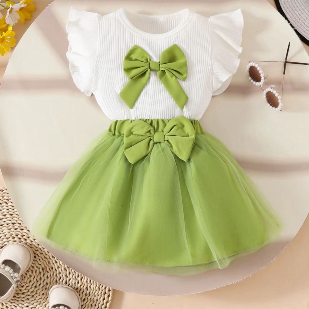 REMERA BLANCA CON MOÑO Y POLLERA TUTU VERDE T 3-4 AÑOS