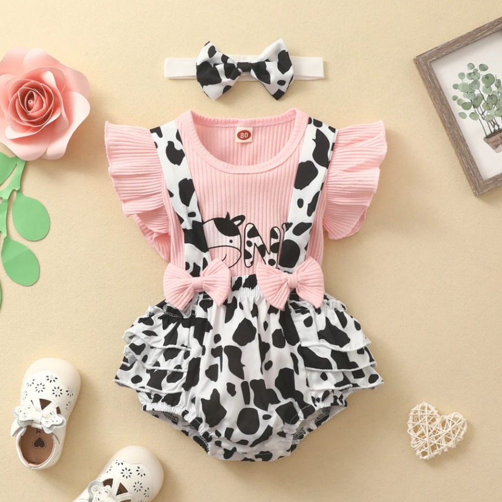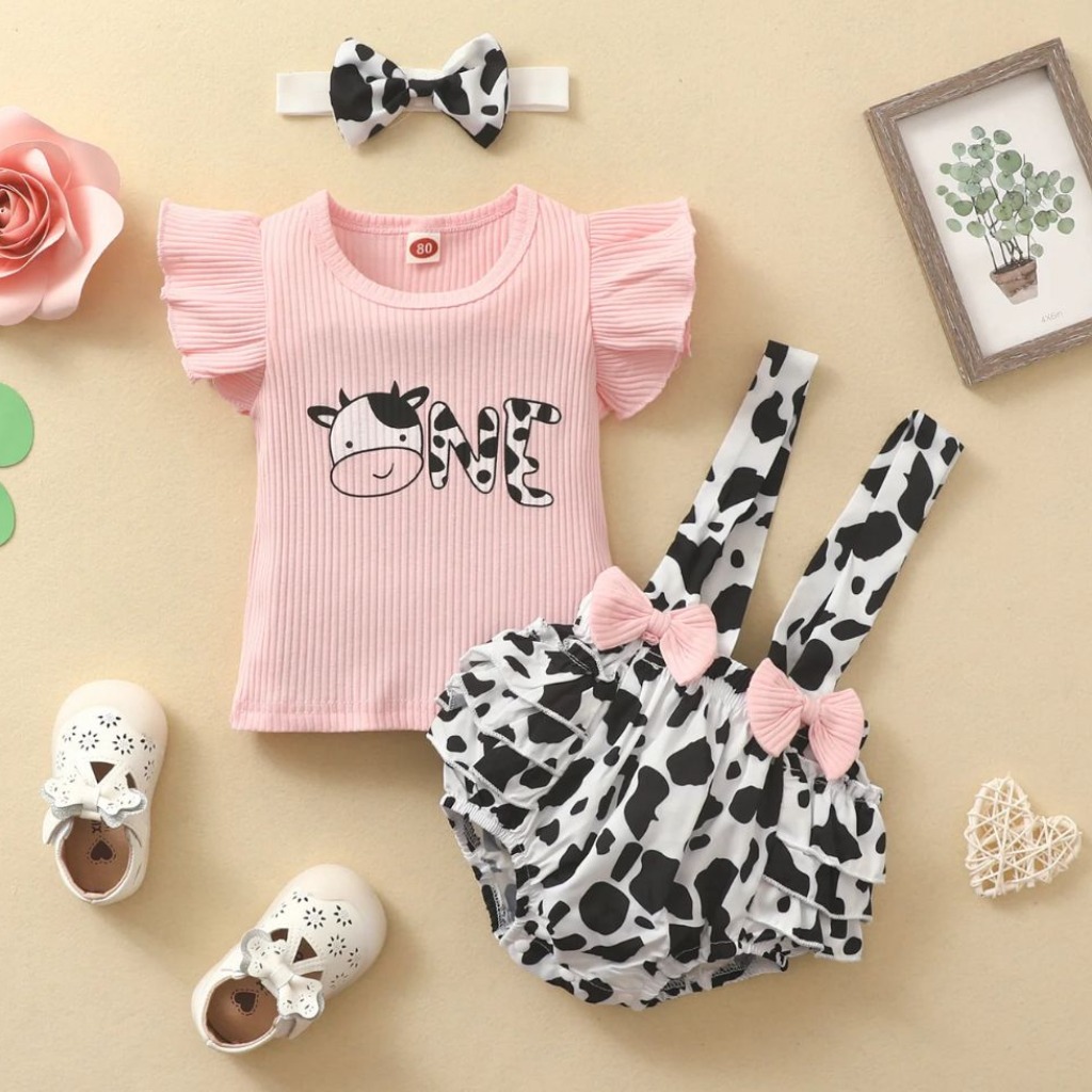 REMERA DE VAQUITA CON SHORT Y VINCHA T 9-12 MESES
