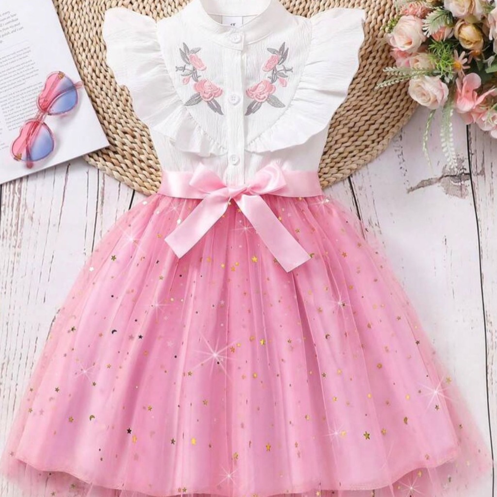 VESTIDO BLANCO Y ROSA CON ESTRELLITAS CON CINTO T 2-3 AÑOS