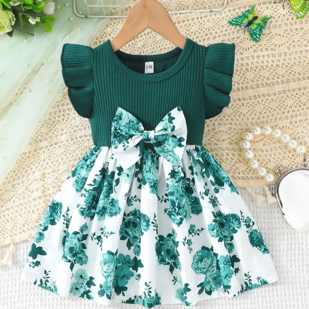 VESTIDO VERDE FALDA FLOREADA CON DETALLE MOÑO 3-6 MESES
